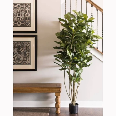 - 6ft Tall Faux Fiddle Leaf Fig Tree: This artificial tree stands at 6ft tall and features 204 large fiddle leaves. With this artificial Fiddle fig trees large size, it is sure to make a statement.