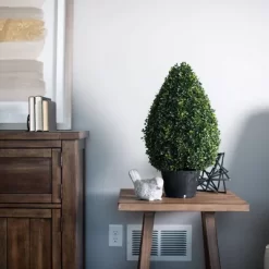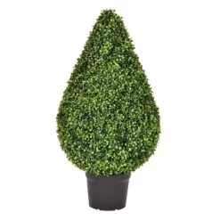 Introduce an eye-catching and low-maintenance accent to your home decor with the Boxwood Faux Topiary Tree. Its natural green boxwood leaves and the design of its trimmed foliage make it a sophisticated and modern option to incorporate some greenery to your indoor or outdoor living spaces. This artificial topiary tree is made of high-quality materials that are UV-resistant, making it a perfect choice for your front door, patio, or any other area. The potted design of this faux boxwood plant makes it easy to display, and its realistic look will make it hard for anyone to tell it’s not a real plant. Ideal for both indoor and outdoor use, this UV-resistant topiary faux tree tree is perfect for those who love artificial topiaries, topiary trees, and faux boxwood plants.
