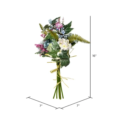 Vickerman 16″ Artificial Rose/Hydrangea Purple Bouquet. This bouquet is a lovely blend of gray tones with muted purples and blues. It features a mixture of roses, hydrangeas, wild flowers, berries, variegated ficus leaves, and fern leaves, all wrapped together with delicate straw.