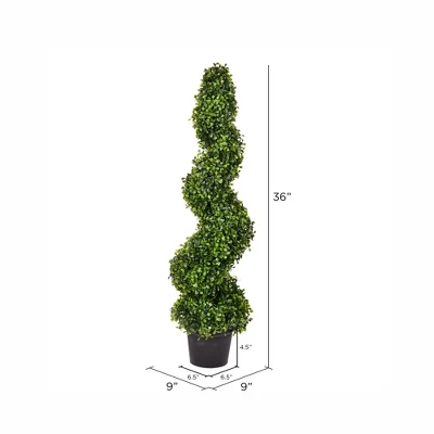 Vickerman Artificial Potted Green Boxwood Spiral Tree. Featuring deep green foliage, a black plastic insertable pot, and is UV treated for outdoor use. Easy to care for, maintenance free, an occasional light dusting is all that is needed.