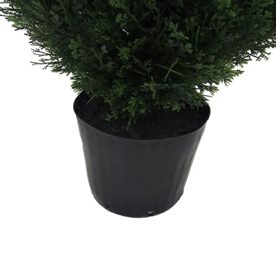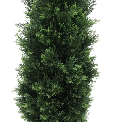 Vickerman Artificial Potted Green Cedar Tree. Featuring deep green foliage, a black plastic insertable pot, and is UV treated for outdoor use. Easy to care for, maintenance free, an occasional light dusting is all that is needed.