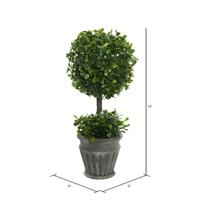 Vickerman Artificial Green Boxwood Topiary In Container. Add a touch of sophistication to your décor with this beautiful Topiary that comes potted in a grey pedestal Urn Container.