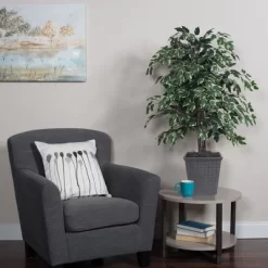 Vickerman Artificial Variegated Ficus Tree featuring detailed leaves that vary in shades of green and white. The real-wood trunks differ in width to give a realistic, natural fullness.
