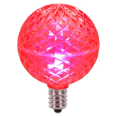 LED Replacement Light Bulbs Item #XLEDG59 Product Features: Bulb color: pink Bulb size: G50 (approx. 2″ diameter) Faceted bulbs E12 nickel base – fits into a standard C7 light socket Screw-in bulb base UL listed, CSA US approved For indoor or outdoor use – weather, fade & peel resistant 130 volts, 60 hertz, 0.37 watts, 2.8 amps Material(s): plastic bulb/nickel base Pack includes 25 of the bulb shown