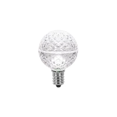 Features: Bulb color: pure white Bulb size: G40 E12 nickel base Faceted bulb Steady-burning Additional Product Features: Long lasting LED bulbs Cool to the touch when lit For indoor/outdoor use 120 volts, 60Hz, 0.45 watts, 0.003 amps Material(s): plastic bulb/nickel base Pack includes 25 of the bulb shown
