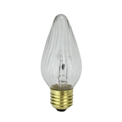 Replace any standard light bulb with this bulb A great idea for novelty lights, restaurants, post lights, table lamps, signs, hurricane lamps and so much more Product Features: Color: transparent clear flame Bulb Size: medium E26 brass base (fits into a standard light bulb socket) Bulb shape: F15 Bulb type: incandescent 130 volts, 40 watts UL listed for indoor or outdoor use Material(s): glass bulb Dimensions: 4.5″ long x 1.625″ diameter Pack includes 25 of the bulb shown